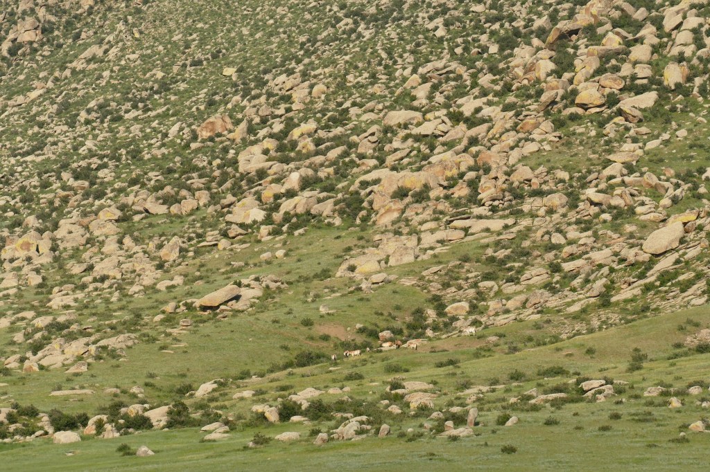 Like pebbles scattered on rocky hillsides, almost invisible, the Takhi graze, play, and take care of their babies. It is movement that gives them away: a family shifting to a better spot for lunch comes suddenly into focus in the stillness.
